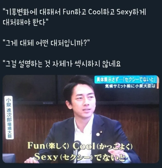 고이즈미 신지로를 이야기할 때 빼놓을 수 없는 것이 바로 ‘펀쿨섹좌(펀하고, 쿨하고, 섹시하게)’ 밈입니다. 이 별명은 2019년 환경대신 시절, 기자회견에서 기후변화 대응 방향을 묻는 질문에 “펀하게, 쿨하게, 섹시하게”라는 표현을 사용한 데서 시작됐습니다.